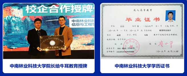 “2”即在校學習2年+“1”即項目實戰半年+企業實訓半年。只需3年就能修完所有課程,并且獲得豐富項目實戰經驗,學員只需交納3年學費,成績合格者即可獲得中南林業科技大學學歷證書。