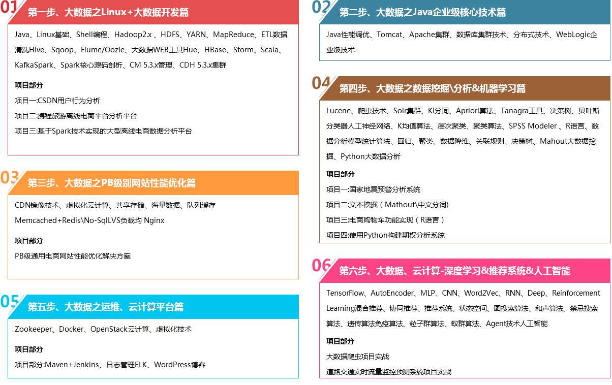 7個階段多達25個左右的商業項目實戰,有影院訂票管理系統、ATM銀行管理系統、亞馬遜在線書城數據庫設計、友邦保險CRM數據庫設計、去哪玩數據庫設計、二嗨租車系統、backStone(數據庫備份還原系統)、旅游網站、游戲網站、個人博客應用系統亞馬遜電商系統、友邦客戶關系管理系統、Oracle CRM系統、Cloud云在線教育平臺、保險經紀平臺、軟件外包平臺、網站PV計算、電商日志流量分析系統、地區銷售額數據和省份銷售排行分析系統、游戲大數據實時