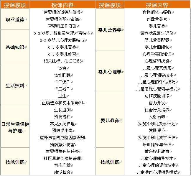 嬰兒生理發(fā)育特點、嬰兒心理發(fā)育特點、嬰兒營養(yǎng)。嬰兒教育、嬰兒飲食、嬰兒智力開發(fā)、嬰兒常見疾病護理、預(yù)防意外傷害、智力開發(fā)、社會行為及人格培養(yǎng)。