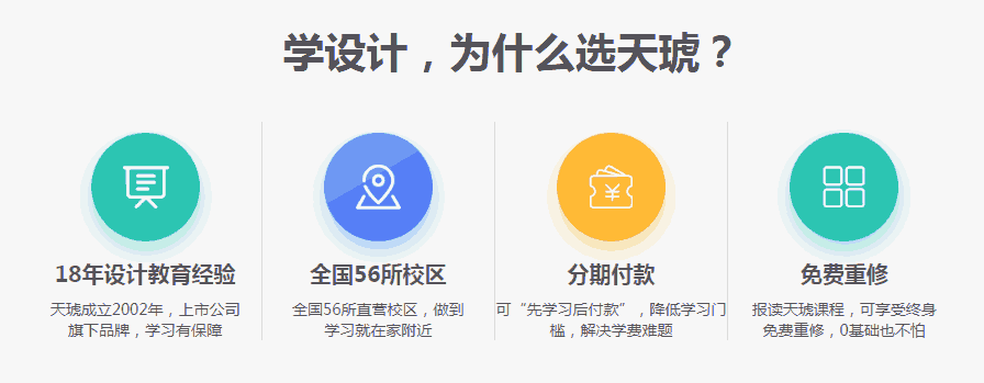 課程研發 武漢天琥設計培訓學校課程由專門課程研發團隊自主研發,課程設計緊跟互聯網潮流,將最前沿的設計融入課程中,并且每年持續精進課程內容和教學建設。目前天琥已開設多個專業方向課程,包括UI設計、平面設計、網頁設計、室內設計等專業。特別值得驕傲,2013年由研發團隊研發的《平面設計精英課程》、《網頁設計精英課程》、《室內設計精英課程》榮獲國家著作權保護,2015年《電商網頁設計精英課程》獲得國家著作權保護!