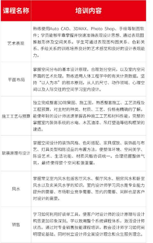 結合實操案例學習真實案例學習,掌握平層、別墅 、辦公、商業空間設計的功能、空間與風格的把握。后期可真正獨立并且全面的完成小型餐飲空間的設計與施工,并熟悉建筑設計行業相關規范及室內裝飾行業現行材料、工藝。